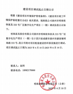 明珠家具股份有限公司崇州市明珠软体家具333号厂区数字化生产项目(一期)位于四川省成都市崇州市廖家镇明珠路333号,我公司将对项目配套建设的环保设施进行调试,项目调试起止日期为2025年4月10日-2025年6月10日。